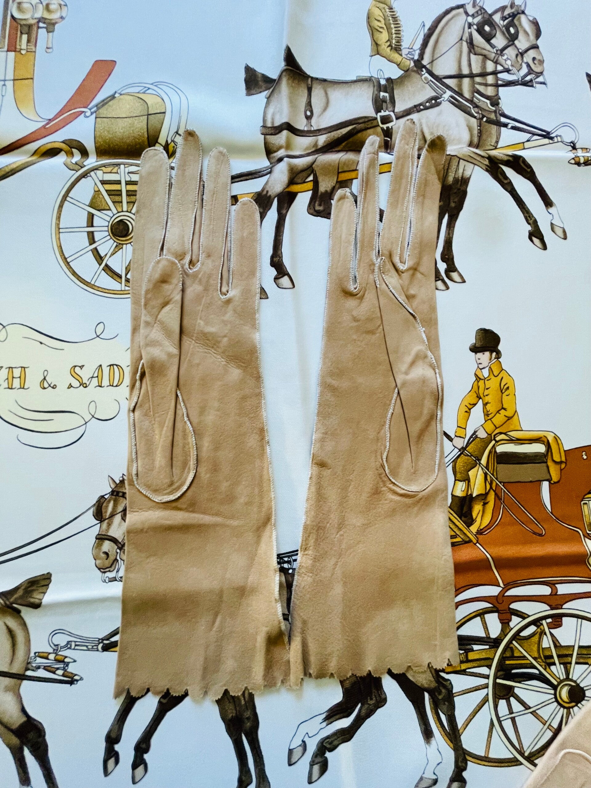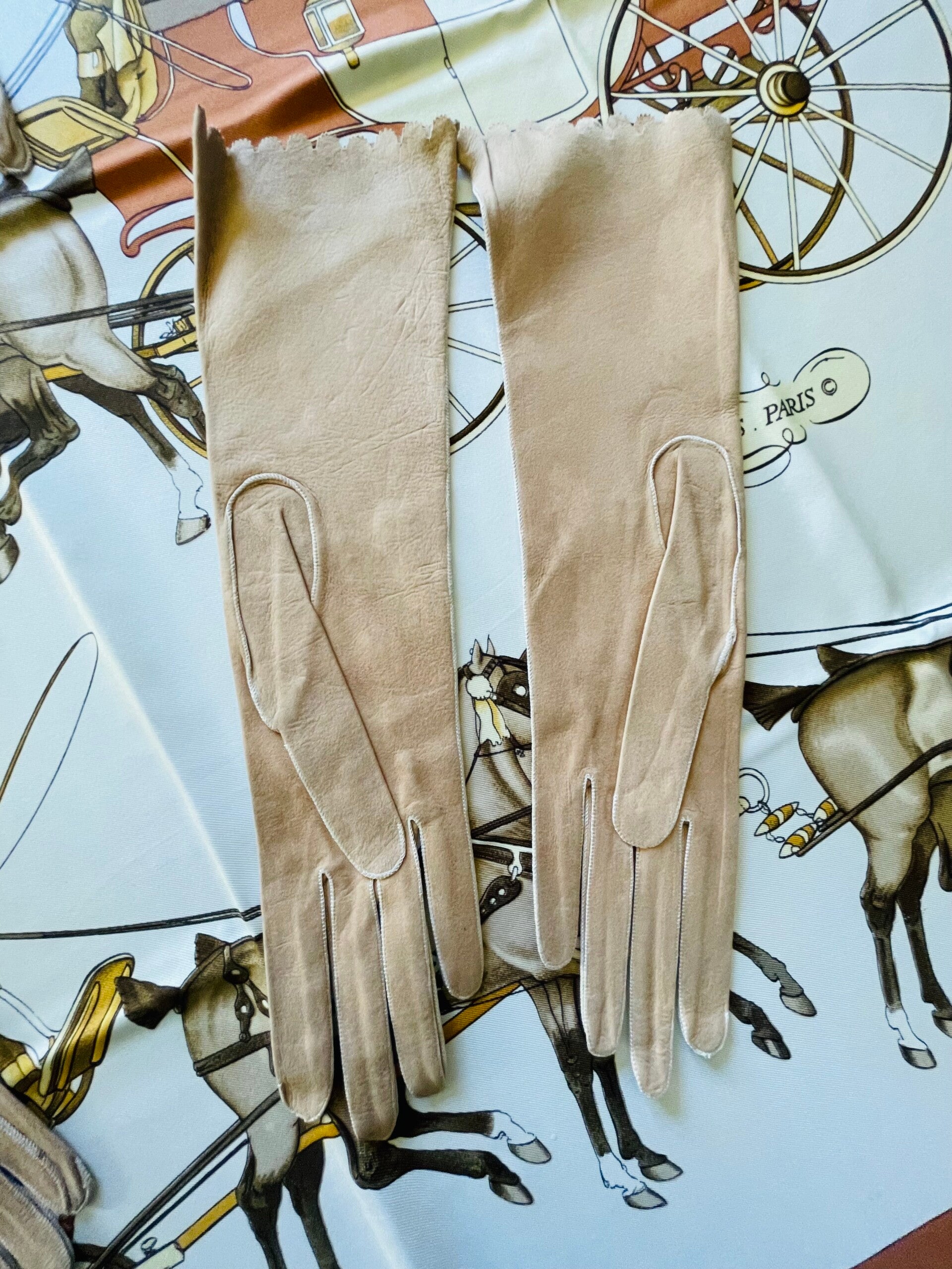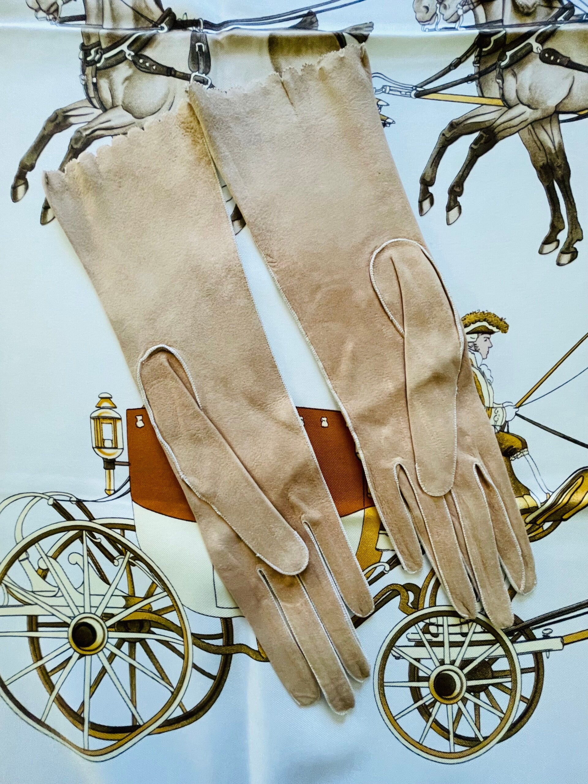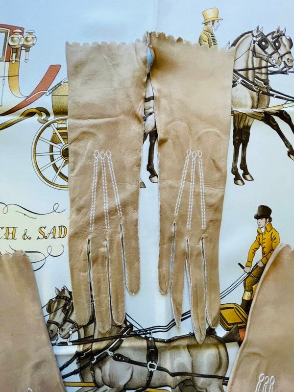 Lot de 3 paires de gants, jamais portés, toujours cousus ensemble aux extrémités, en chevreau, taille 6,5 de couleur chamois clair, bords poignets festonnés, ayant appartenu à Feu Mme la Contesse Hélaine CHASTELAIN de THEROUANNE, contesse de MALHERBES. Pas de manque, pas de trou. Très bon état de conservation et d’usage voir les détails sur les photos.
