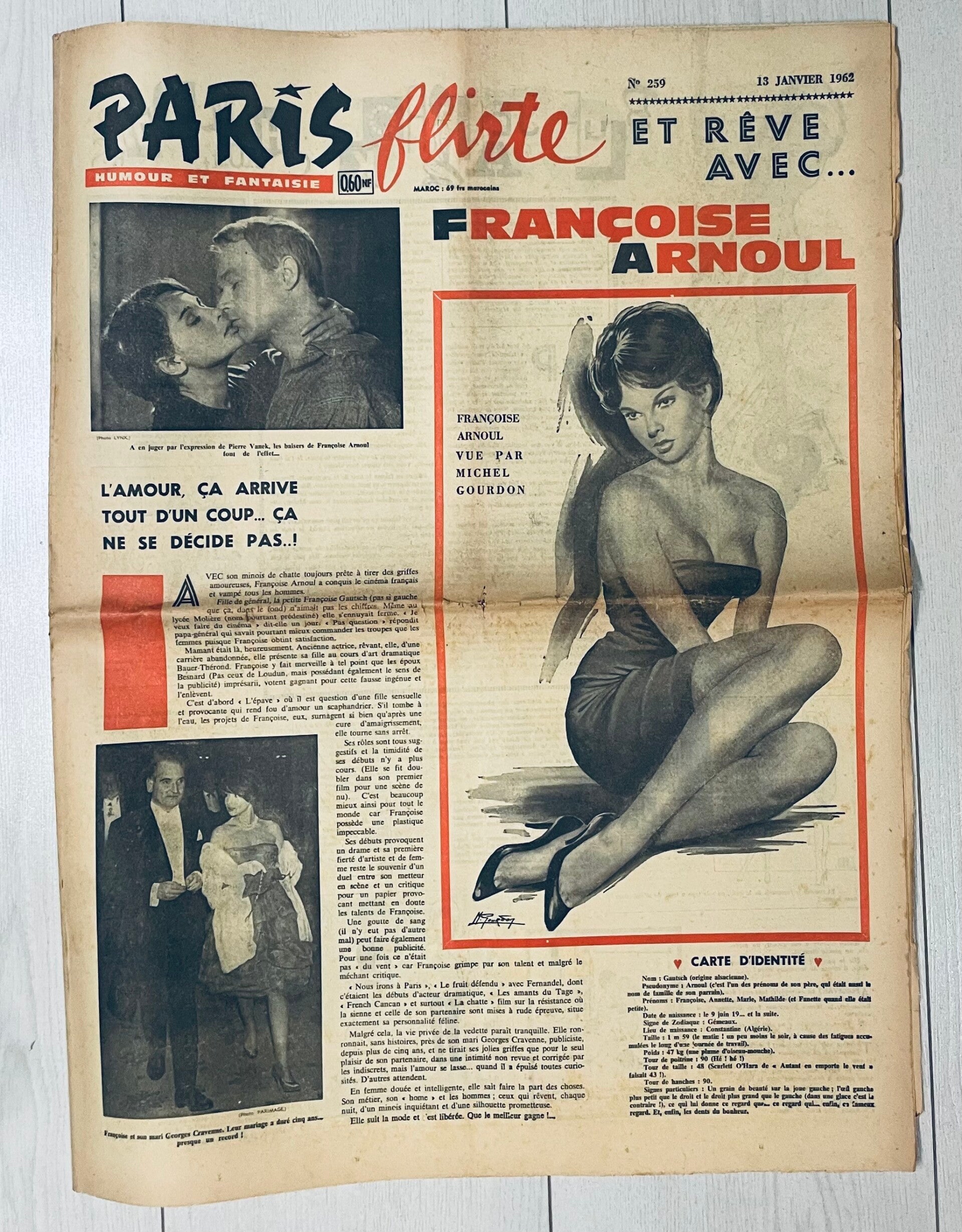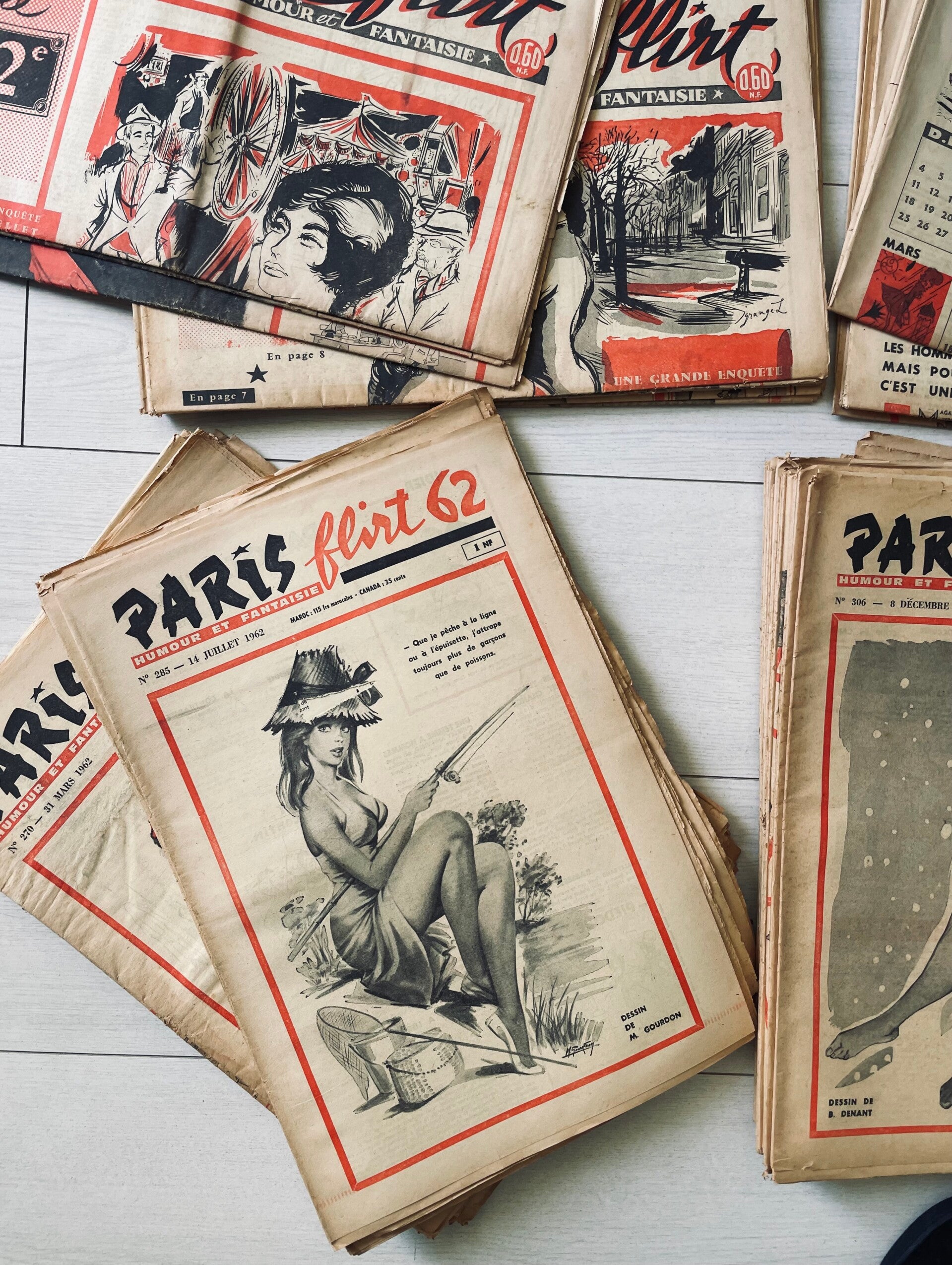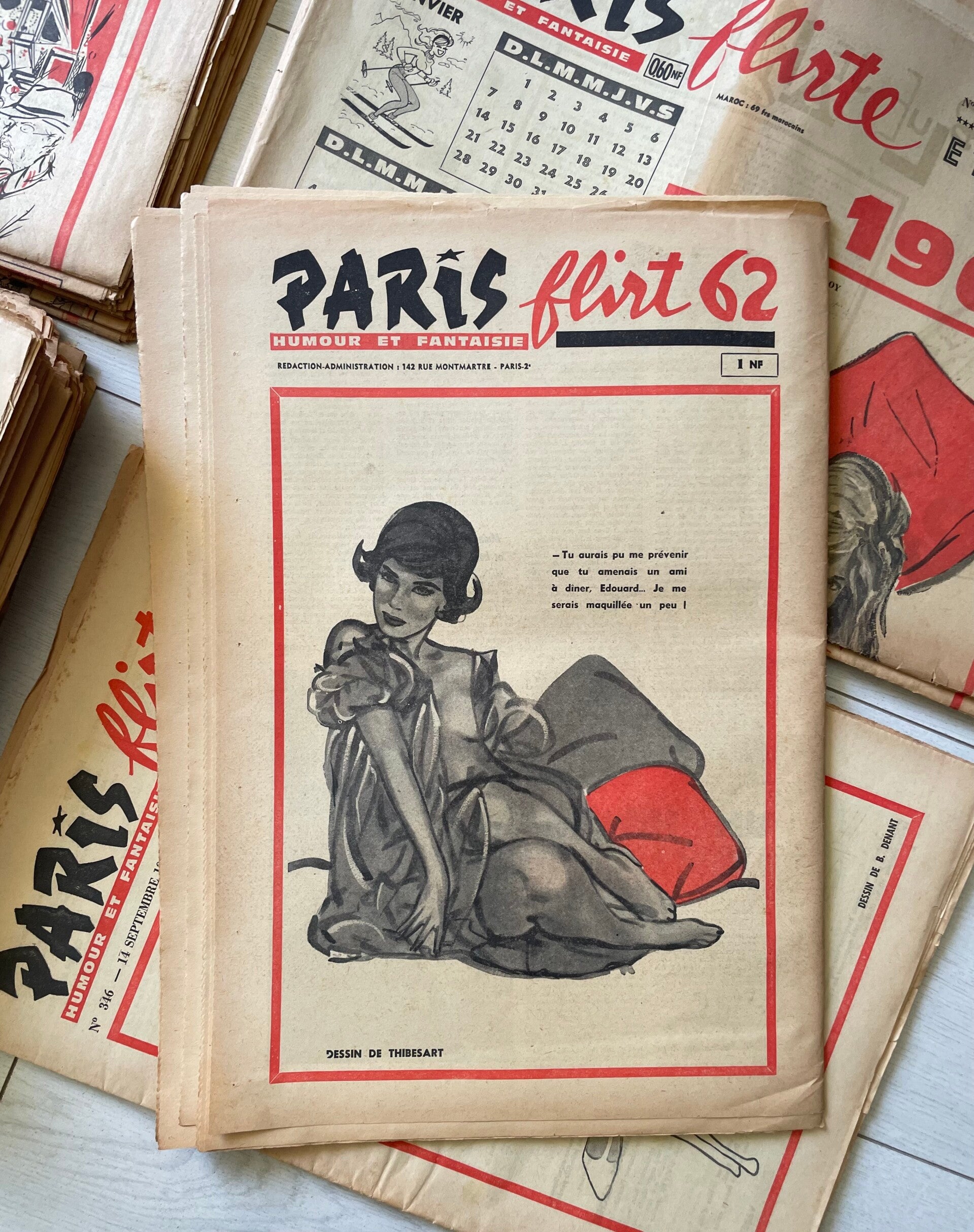53 exemplaires du grand journal mondain « PARIS FLIRT » « Humour et Fantaise »- Au 143 Rue Montmartre Paris- Directeur de la Publication Alfred Rayez, des l’année 1960, 1961,1962, 1963. Les années soixantes étant considérées comme le début des années « Peace and Love ».