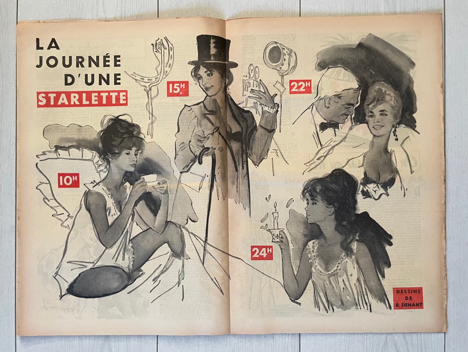 Ce magazine de charme, d’humour et de fantaisie comportait de nombreux et magnifiques dessins humoristiques en double page centrale, de pin-up en rouge et noir, parfois colorés de vert, de petites histoires humoristiques, signés par les artistes de renom de l’époque, comme : B. Denant - M. Gourdon - Thibesart - Pierre-Laurent Brenot etc… des histoires sous forme de romans, des informations sur les artistes de l’époque et locales dans la vie de tous les jours etc.…
