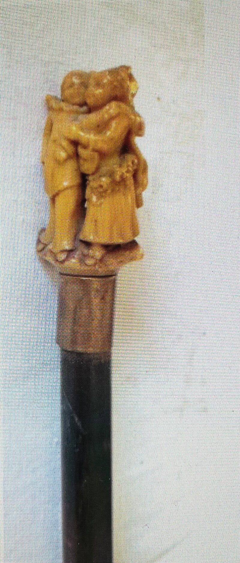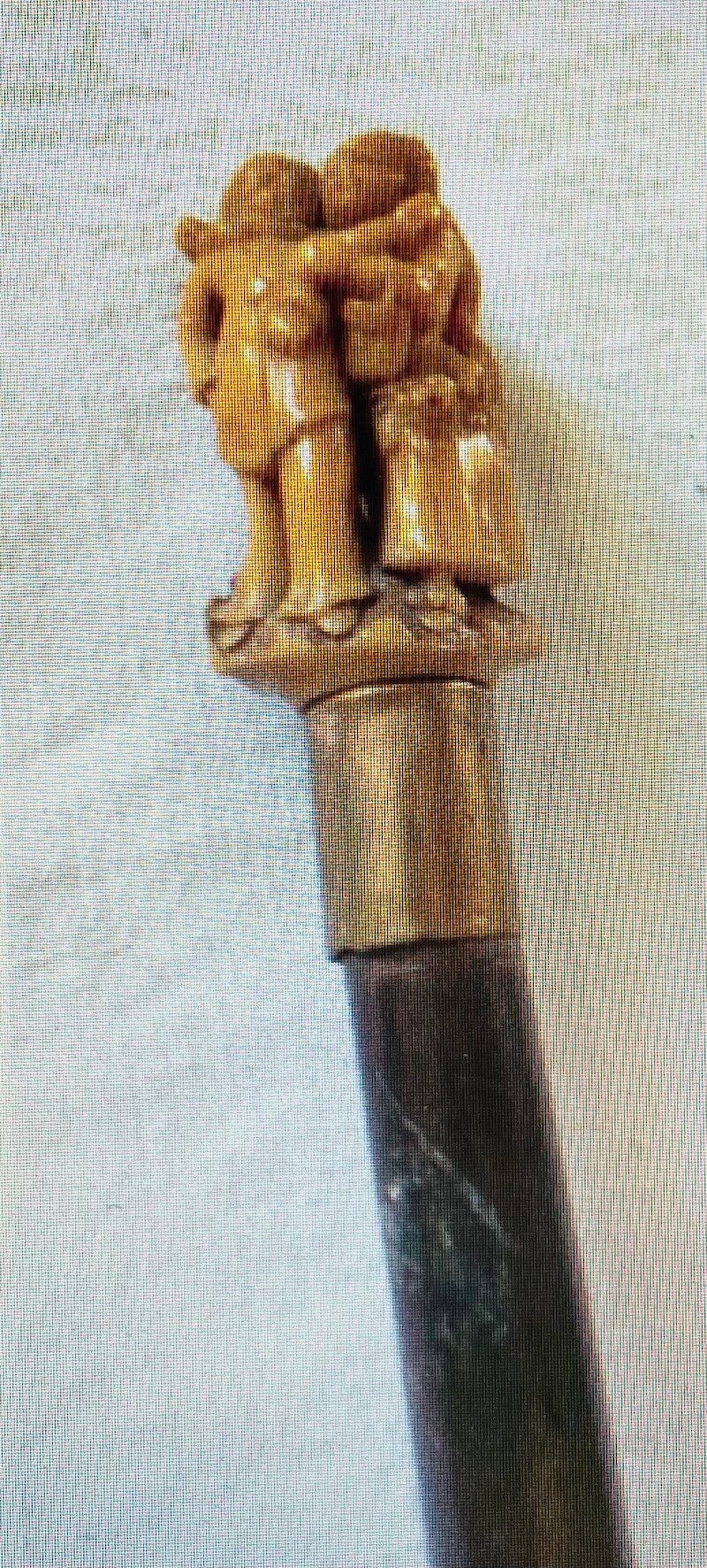 Canne à fût bois et fêrule en métal , pommeau en ivoirine à décor du théme " Pierrot & Colombine " .