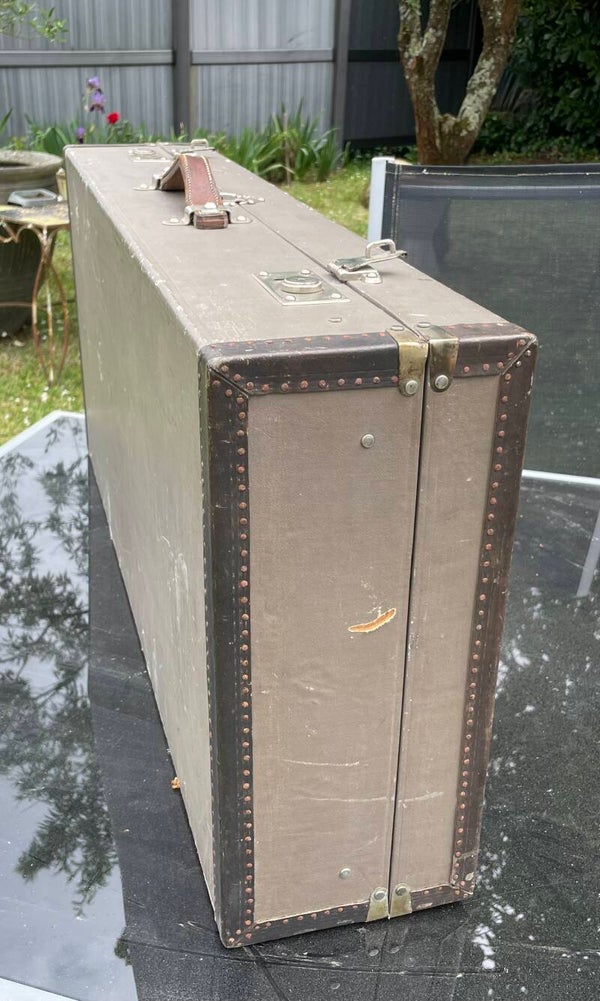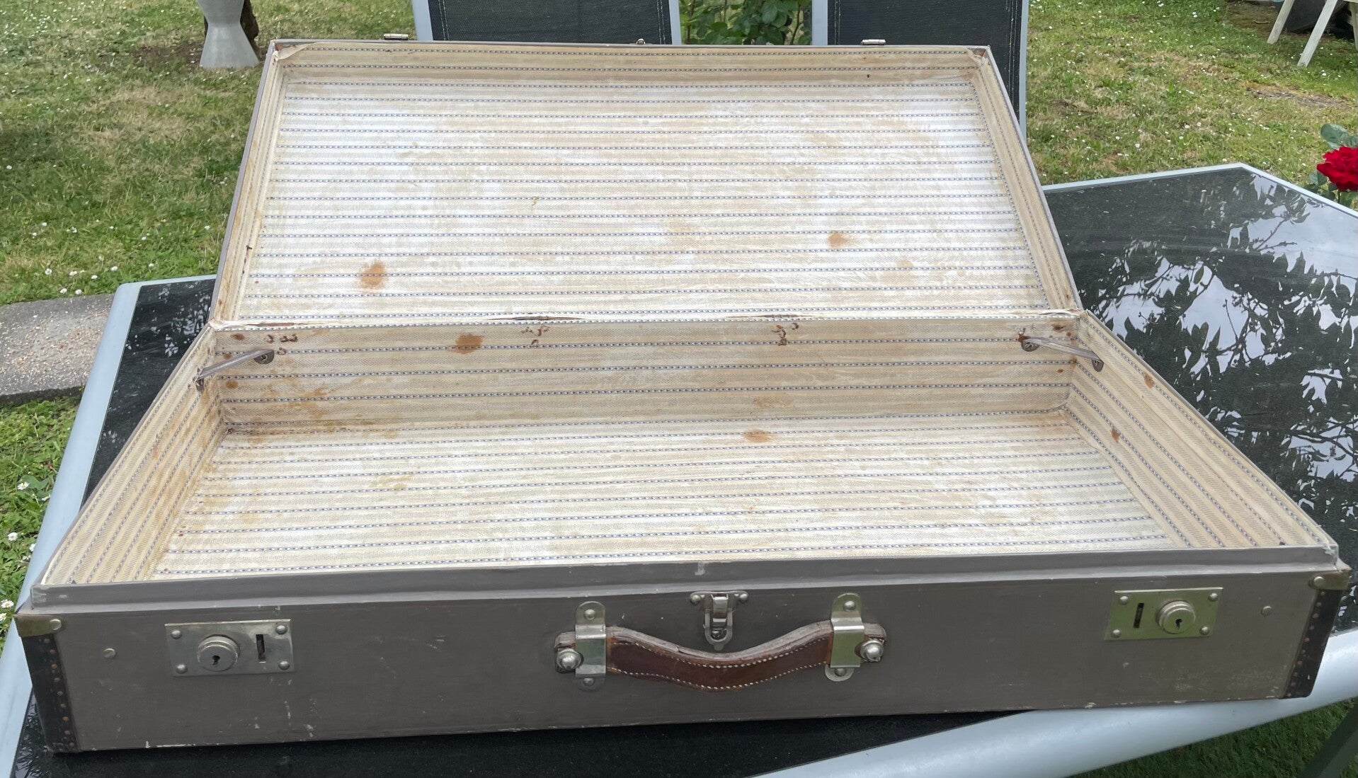 Malle de voyage en bois recouverte de toile enduite taupe, doublé en tissu rayé à revoir. Dimension fermée : 87 x 40 x 18,5 de profondeur. Une poignée centrale. Les trois points de fermeture en état de fonctionnement. Bon état d’origine et d’usage, dans son jus et sa patine, voir les détails sur les photos.
