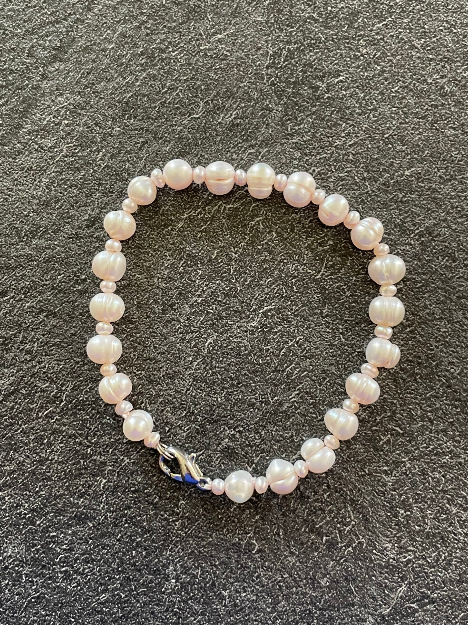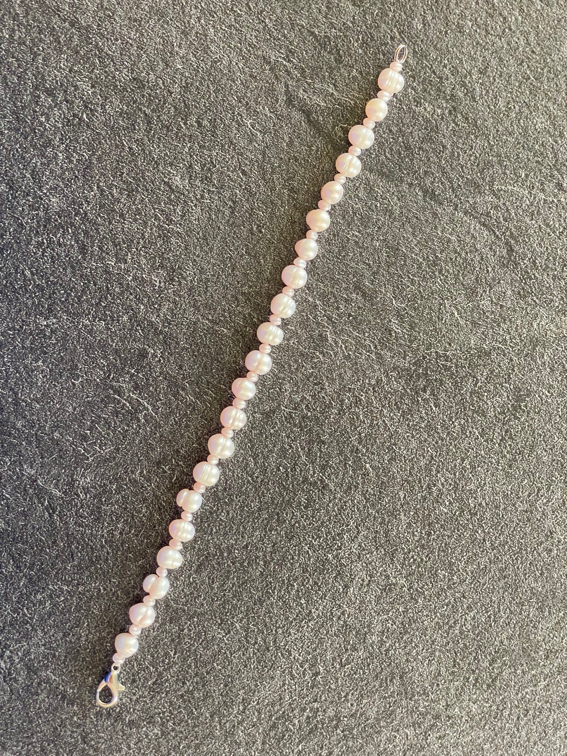 Baroque freshwater pearl bracelet, interspersed with small pearls. Lobster clasp. Dimensions when open: 19 cm long - Weight : 10 grams. In good condition, both used and preserved. See photos for details.