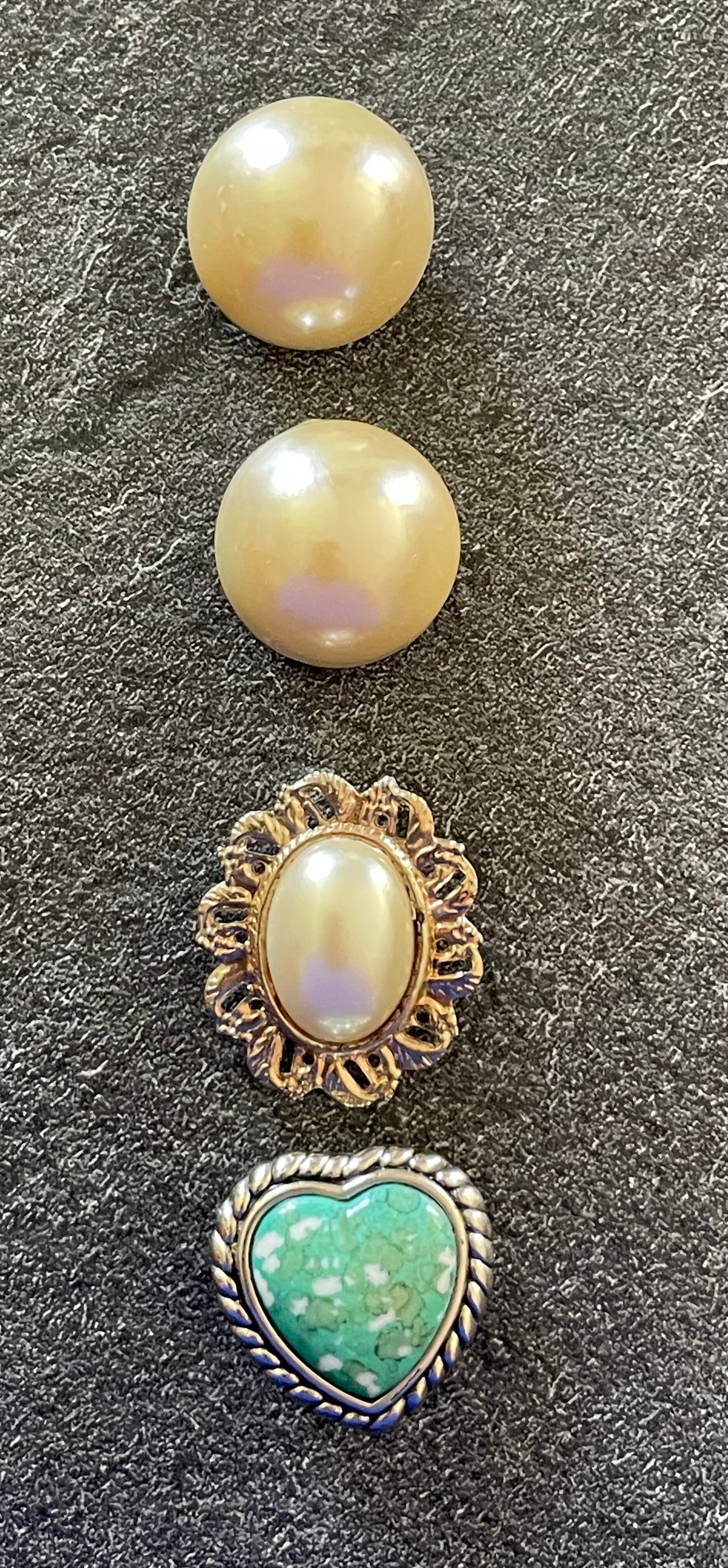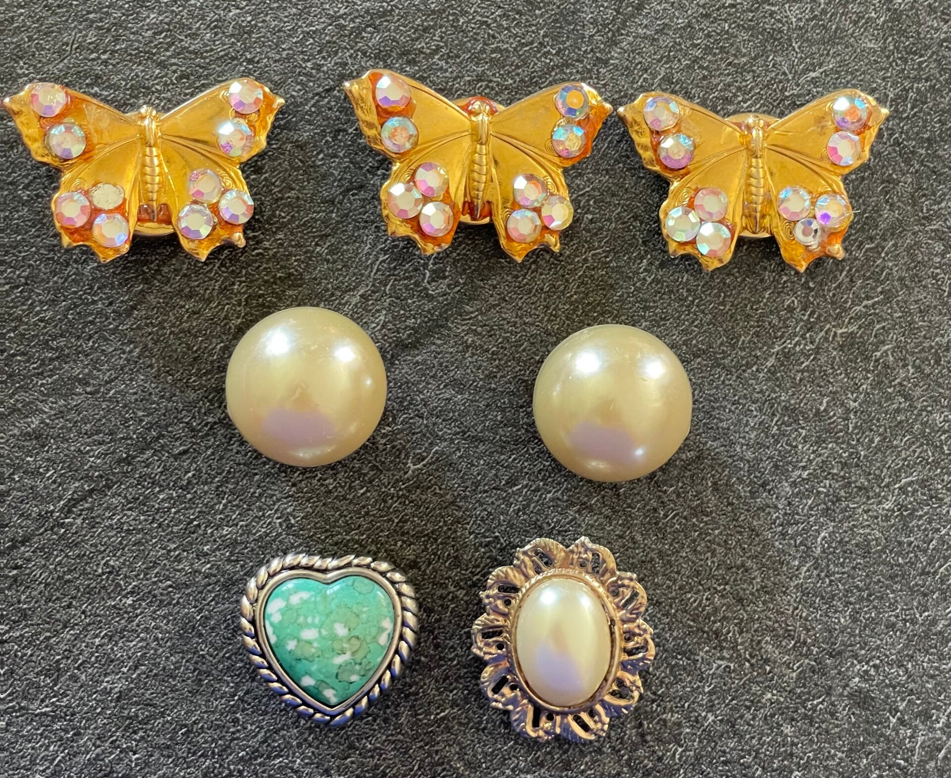 Réunion de 6 caches boutons, représentant papillons dorés et strass, demi boule nacrée, coeur et fleur sytlisée. Habillent de façon orignal un chemisier ou veste légère. Dimensions papillons 2,5 x 2 cms- boules nacrées 2 x 2 cms - coeur : 2 x 2 cm cms- fleur 3 x 2,5 cms. Poids total des 4 pièces : 23 grs. En bel état d’usage et de conservation voir les détails sur les photos.