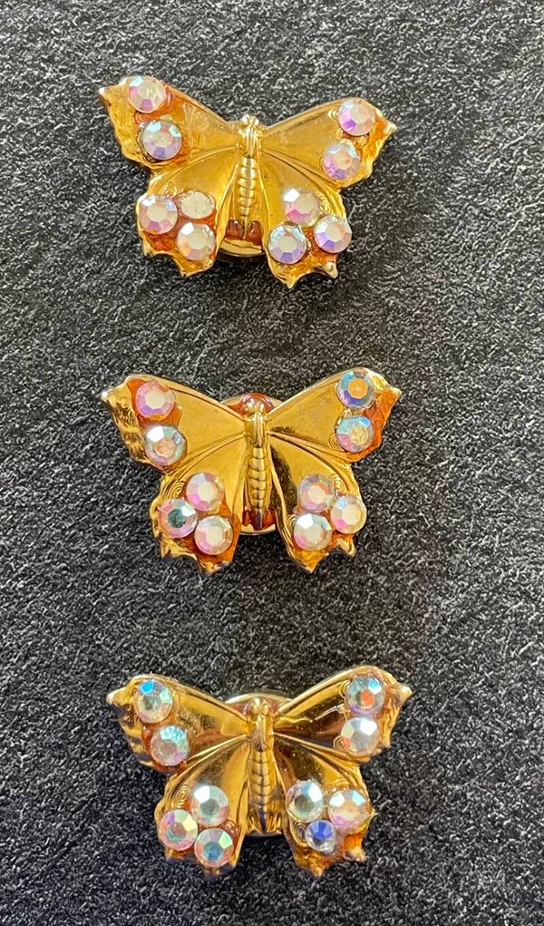 Set of 6 button covers, featuring gold and rhinestone butterflies, a mother-of-pearl half-sphere, a heart, and a stylized flower. They add a unique touch to a blouse or light jacket. Size : butterflies 2.5 x 2 cm - mother-of-pearl half-spheres 2 x 2 cm - heart 2 x 2 cm - flower 3 x 2.5 cm. Total weight of the 4 pieces: 23 grams. In good used and preserved condition, see photos for details.