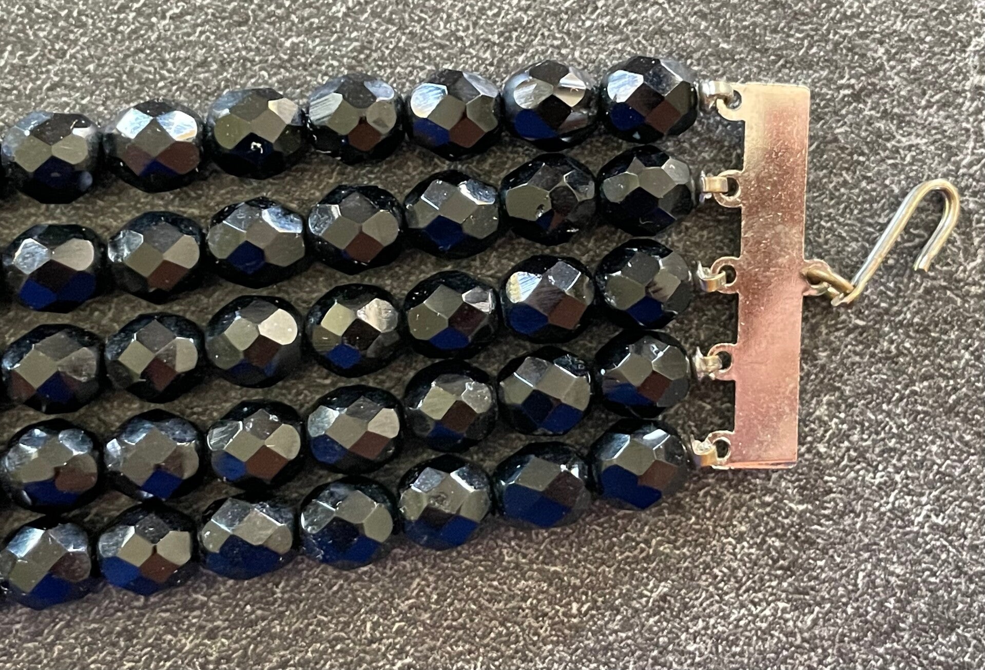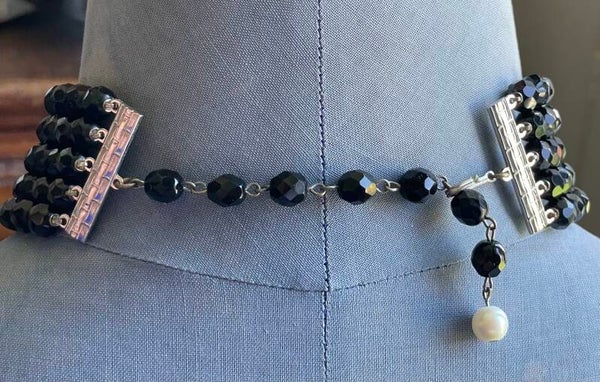 Collier vintage ras du cou, dit collier de chien à cinq rangs de perles de verre facettées noires, et perles blanches, séparateurs en strass. Fermeture par crochet, voir les photos. Bel état de conservation et d'usage, pas de manque, voir les détails sur les photos. Dimentions ouvert : 29 cms. Poids : 111 grs