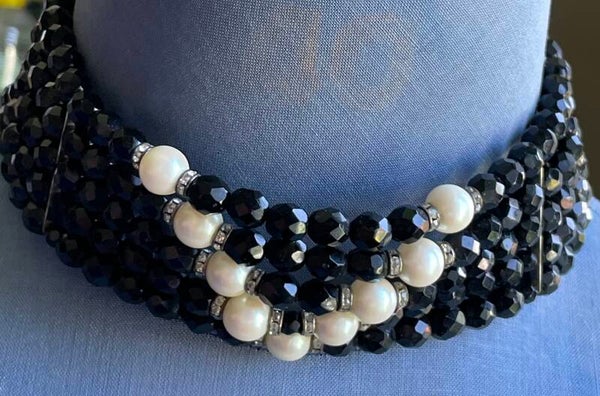 Vintage choker necklace, also known as a dog collar, with five strands of black and white glass beads, and rhinestone spacers. Hook closure, see photos. In excellent condition, with no missing beads, see photos for details. Dimensions when open: 29 cm. Weight: 111 grams. Free shipping within France. International shipping rates available upon request, depending on the destination country. Visit our other items on this site and in our PROANTIC LE LYS ET L'EPEE gallery.